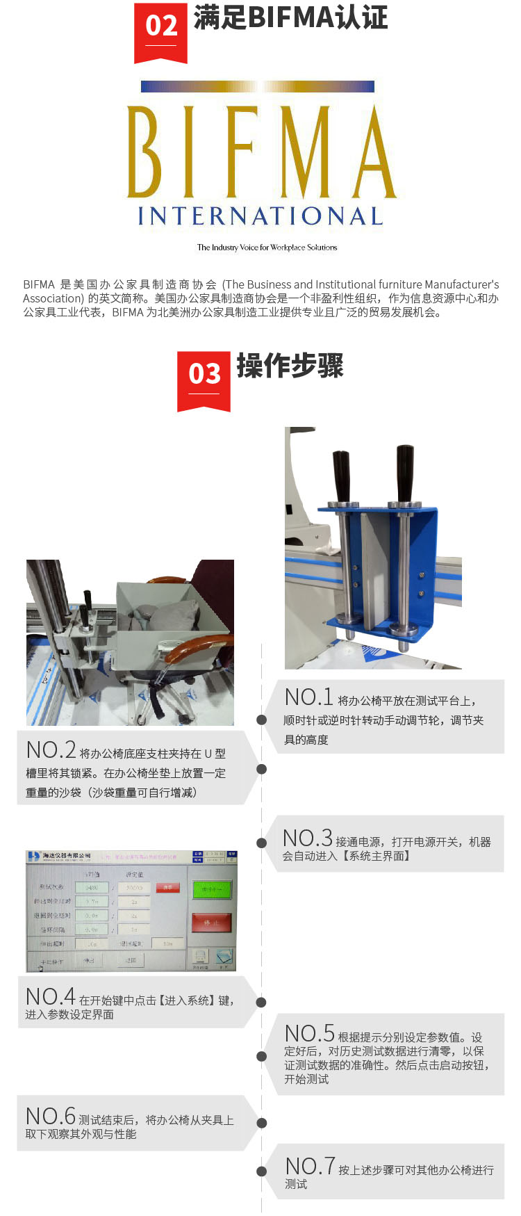 本機適用於所有帶腳輪或椅輪的辦公椅(yǐ),評核腳輪及椅框對於抵受椅子前後移動所引起的疲勞壓力及磨損能力。 設計標(biāo)準:Bifma5.1 第17節;Bifma 5.5 第8 節;Bifma 5.9 第11節 | ||