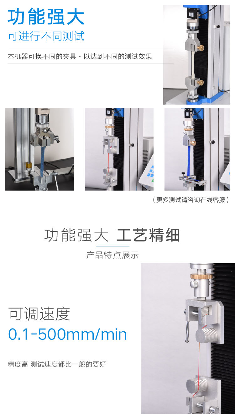 指標參數容量5kg,10kg,15kg,20kg,30kg,50kg,100kg,200kg,可選電機400w鬆下(xià)伺服電機驅(qū)動器400w鬆下伺服(fú)驅動(dòng)器絲杆進口滾珠絲杆控製方(fāng)式麵板控製(觸摸屏),可連電(diàn)腦速度可調0.1-500mm/min最大行程900mm(不含夾具)荷重分解(jiě)度1/250,000荷重(chóng)精度≤0.5%單位切換gf/kgf/N//kN/LBf/T外形尺寸520*515*1250mm(L*W*H)淨重約70KG電源AC 220V整機功率(lǜ)500W 海(hǎi)達多功能拉力試驗機型號用途對比以下多(duō)功能材料試驗(yàn)機可進行:抗拉強度、抗壓(yā)強度及伸長量,可做剝離(lí)、撕裂(liè)、抗彎、抗折(shé)、壓縮等試驗。適用:膠帶、標簽、膠黏劑、保護膜、鍍層、金屬、電子(zǐ)、電線電纜、防水卷材、PCB材料、鋁合金(jīn)、編織袋、塑料、橡膠、無紡布、安全帶等很多行業材料。型號款式特點容量1kg=9.8N測試功能適用材料HD-B602單柱電子式,經濟型(xíng)200kg拉伸(shēn)、壓縮(suō)、彎(wān)曲、撕裂、延伸率(lǜ)、剝離、剪切、粘接力、高粘剝離測試端子拉力、塑料件拉伸、密封圈(quān)……HD-B609單柱電腦(nǎo)式 雙顯200kg薄膜、塑(sù)料、離(lí)型紙/膜(mó)、膠(jiāo)帶、紙張(zhāng)、複合帶、打包帶、鋁箔、保護(hù)膜(mó)、鋁塑板……HD-B609B-S單(dān)柱電腦(nǎo)伺服式200kg薄(báo)膜、離(lí)型紙/膜、膠帶、紙張、複合帶、打(dǎ)包帶、鋁(lǚ)箔、保護膜、鋁塑板、鏡片(抗壓)、吸波材料(抗壓)……HD-B617 單柱電腦式雙顯(xiǎn)500kg線束、端(duān)子、橡膠、塑料……HD-B617-S單柱電(diàn)腦伺服式500kg線(xiàn)束、端子、橡膠、塑料……HD-B603雙柱 門式電腦式2T拉斷、拉伸、抗壓、三點抗彎、四點抗彎曲(qǔ)測試 、撕裂、剪切等(děng) 電線電纜、木材、某些金(jīn)屬、塑料、打包帶、背(bèi)包、塑料桶(抗壓)、焊接點、安全(quán)帶(拉伸(shēn))、防水卷材(拉伸)……HD-B604-S雙柱門(mén)式電腦伺(sì)服式(shì)2T電線電纜、橡膠、鏈輪、PVC手套、木材、打包帶、某些金屬、焊接點、木地板鎖(suǒ)扣 ……HD-B604B-S雙柱門式電腦伺服式2T電線電纜、橡膠、鏈輪(lún)、PVC手套、木材、打包帶、某些金屬、焊接點、木(mù)地板鎖扣、安(ān)全帶(拉伸)、防水卷材(拉伸)……HD-B615-S雙柱門式電腦伺服(fú)式5T金屬、鋼絲、鋼絲繩……HD-B612-S雙柱門式電腦伺服式10T~30T拉伸、壓縮、彎曲、粘合、剪切(qiē)、環剛度、彈簧拉壓金(jīn)屬板材、鋼絲、鋼管、鋼板(bǎn)、鋼(gāng)筋……HD-B616雙柱門(mén)式油缸下(xià)置式30T/60T/ 100T抗拉(lā)、抗壓、屈服強(qiáng)度等金屬板材、鋼絲、鋼管(guǎn)、鋼板、鋼筋……HD-B607-S雙柱門式高低溫環境 電腦(nǎo)伺服式3T高低溫、抗拉(lā)、抗壓等塑料、橡膠……夾具提示:200多款不(bú)同夾具,具體需依據客戶具體測試(shì)樣品選型。備注:以上參數僅(jǐn)供參考,為對客戶負責,具體材料選型請以銷(xiāo)售溝(gōu)通後為準。 產品特(tè)點 (一)結(jié)構特(tè)點(diǎn) 1.機殼采用A3鋼板,使用精密激光切割及數控折床(chuáng)彎折、焊接成型,附著光澤白與金屬藍配色的烤漆塗裝; 2.采用雙顯雙控的操作係統,可連接電腦通過軟件進行試驗,也可通過觸摸屏設置參數(shù)進行試驗; 3.柔性風琴式一字防護罩,質感輕柔,有效防止因材質過硬,摩擦產生振動(dòng)所帶(dài)來的過大異響; 4.設(shè)備采用行(háng)星減(jiǎn)速機,具有(yǒu)效率高、運轉平穩、噪聲低、適應性強等(děng)特點。 (二)測(cè)試係統 1.多通道測力係統(tǒng),可同時校準四個傳(chuán)感器,適用多種量程傳感器(qì)選配(pèi); 2.配置鬆下伺(sì)服電(diàn)機係統,搭配精(jīng)密滾珠絲杆多軸(zhóu)定位(wèi)技術,位移(yí)精度0.5級,傳動係(xì)統效率高、傳動平穩; 3.控製器采用我(wǒ)司自主研發力值測試軟件,可完成參數設定、運(yùn)行狀態控製、數據收集、分(fèn)析處理及監控、結果報表輸出; 4.軟件有英語、中文簡體(tǐ)與繁體(tǐ)三種(zhǒng)語言形式可選,使用方便; 5.限位保護、過載保護、自動回位等智能設計,保證操作(zuò)安全。 | ||
