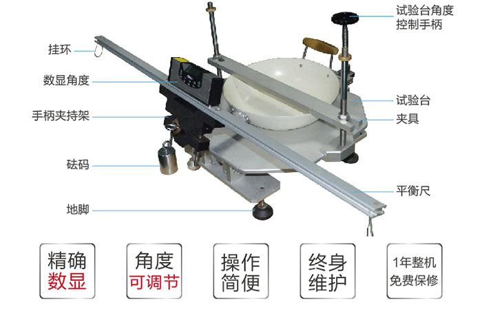 指標參數數顯角度尺BevelBox DP-180WM(2按鍵)平衡杆長1米重1KG±0.1KG(包括附件及(jí)指針,手(shǒu)柄夾持(chí)架(jià))砝碼1kg最大(dà)樣品尺寸(cùn)450×450×180mm(L*W*H)刻度分辨率0.1°外形尺寸1100×532×389mm(L*W*H) 把試樣固定在(zài)測試平台上,調節緊固裝置的角度,使連接炊具(jù)手柄的平衡杆達到水平,同時指針指向分度表的零位(wèi)。把測試砝碼分別懸掛於(yú)平(píng)衡杆(gǎn)的一端並保持靜止30s,角度尺記錄平衡杆偏轉的角(jiǎo)度,檢查手柄和連接部件,記錄試樣(yàng)的損壞情況。 操作步驟 1、將樣品預先做耐熱試驗;平橫杆長1m 、重1Kg±0.1Kg,其中包括附件及(jí)指針(zhēn),手柄夾持架(jià),安裝時(shí)夾持架圓心(xīn)與手柄圓心重合,杆與手柄(bǐng)無相對移動(dòng); 2、將手柄組件在手柄長度方向的中點(diǎn)處(chù)與測試平(píng)衡杆緊固; 3、將測試樣品裝與測試機架(jià)上,並調整測試平衡杆使其水平; 4、將(jiāng)測試砝碼置於測試(shì)平衡杆左側(cè),穩定30S後計下指針偏角; 5、將測試砝碼置於測試平衡杆右側,穩(wěn)定30S後(hòu)計下指針偏角; 6、檢查手柄及連接件,並記(jì)錄(lù)損害程度 | ||