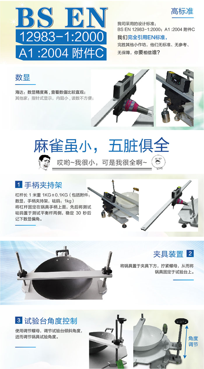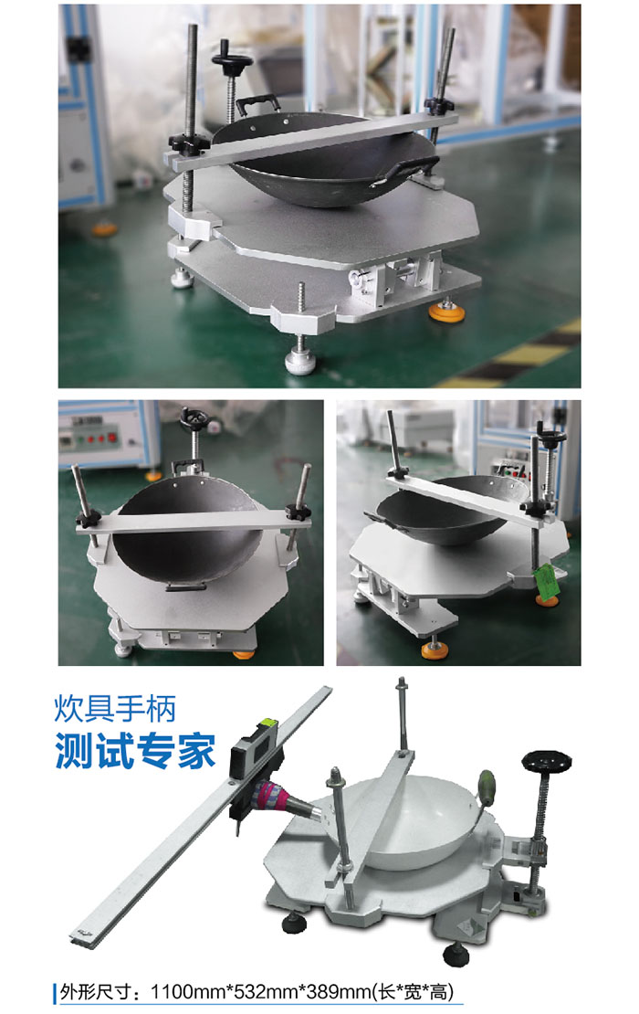 炊具(jù)手柄抗扭(niǔ)矩測試儀對廚(chú)具進行扭曲試(shì)驗,手柄在各個方向上的扭曲變形不超過10°,變(biàn)形程度不能影響手(shǒu)柄的使用功能,試(shì)驗後緊固件無鬆(sōng)動,以此(cǐ)評定廚具手柄抗(kàng)扭矩等級。 設計標準:BS EN 12983-1:2000 + A1 :2004 | ||