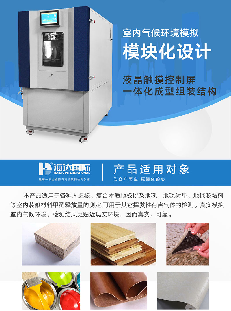 甲(jiǎ)醛試驗箱(1個(gè)立方)適用(yòng)於各種人造板、複合木質地板以及地毯、地毯襯墊及地毯膠粘(zhān)劑等室內裝修材料甲醛釋放量的測定、木材或人(rén)造板的恒溫、恒濕平(píng)衡(héng)處理,也可用於其它建材中揮發性有害氣體的檢測。該產品特點在於可(kě)大限度的模擬室內氣候環境,檢測結果更貼近現實環境,因而(ér)真實、可靠。 工作原理: 將(jiāng)1平方米表麵積的樣品放人溫度、相對濕度、空氣流速和空氣置(zhì)換率控製在一定值的氣(qì)候箱內(nèi)。甲醛從樣品中釋放出來,與箱內空氣混合,定期抽取(qǔ)箱內空氣,將抽出的空氣(qì)通過盛有蒸餾水的吸收瓶(píng) ,空氣中的甲醛全部(bù)溶入水中;測定吸收液中的甲醛量及抽取的空氣體積,用毫克每立(lì)方米(mg/m³)表示,計算出每(měi)立方米空氣中(zhōng)的甲(jiǎ)醛量。取樣是周期性(xìng)的,直到測試箱內甲醛濃度達到平衡狀態。 設計標準: 1、GB18580—2017 《室內裝飾裝修材料 人造板及其製品中(zhōng)甲醛(quán)釋放限量》 2、GB18584 《室內裝飾裝修(xiū)材料木家(jiā)具(jù)中有害物質限量》(審批稿) 3、GB18587—2001 《室內裝(zhuāng)飾裝修材料地毯、地毯襯墊及地(dì)毯膠粘劑有害物質釋放限量》 4、GB17657—2013 《人造板及飾麵人造板理化性能實驗方法》 5、GB50325—2010(2013 年板)《民(mín)用建築工(gōng)程室內環境汙染控製規範》 6、ASTM D6007—02《小尺度環境箱測(cè)定木製品釋放氣體中甲醛濃度的標準測試(shì)方法》 7、LY/T 1612-2004《甲醛釋放量檢測用(yòng)1m3氣候箱》 8、SZJG 52-2016《家具(jù)成品及原輔材料中有害物質(zhì)限量》 9、GB/T 2912.1-2009 《紡織品 甲醛的測(cè)定(dìng) 第1部分:遊離和水解》 10、GB/T 2912.2-2009 《紡織品 甲醛的(de)測定 第2部分:釋放的甲醛(蒸汽吸收法)》 11、GB/T 2912.3-2009 《紡織品 甲醛的測定 第3部分:液相色譜法》 | ||