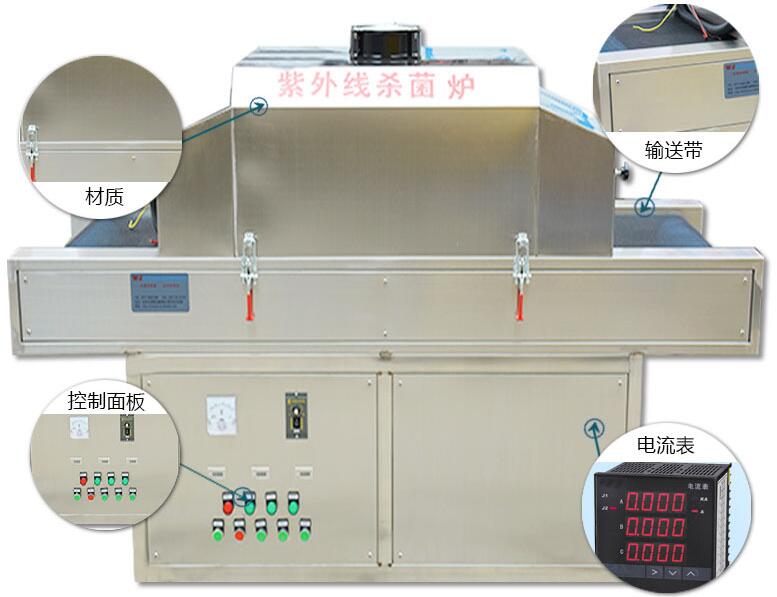 1.工作區隧道外體:1.2mm不鏽鋼一套 2.工作區(qū)隧道(dào)內腔:1.0mm不鏽鋼板(bǎn)一套 3.機體支撐架:方通鋼一套型號:2″方通 4.運風係統:強(qiáng)製運風組合抽風機一套(抽出有害氣體) 5.輸送帶(dài):鐵氟龍 6.運輸馬達:800W(變頻器調速) 7.調速器:40W 8.抽風機:CY-125型 9.電流表(biǎo):50A一套 10.電壓表:220V一(yī)套 11.工作電壓:200V--220V(±5)三(sān)線製(zhì)50Hz 紫外線光源有效輻(fú)射 燈管長(zhǎng)度(dù)600mm UV紫外線殺菌燈管16支(zhī)*20W紫外線燈居內腔縱向(xiàng),上、下安裝波長253.7nm,1米(mǐ)距離射強度為160微瓦/平方厘米以上。使用壽(shòu)命為8000小時以上。 其他產品參數: 1.設備(bèi)全長:2000mm 2.工作區域:1000mm 3.進料作(zuò)業區域:500mm出料作業區域:500mm 4.出入(rù)口高度:180mm 5.輸送帶寬度:500mm 6.輸送帶距地麵(miàn):750±20mm |