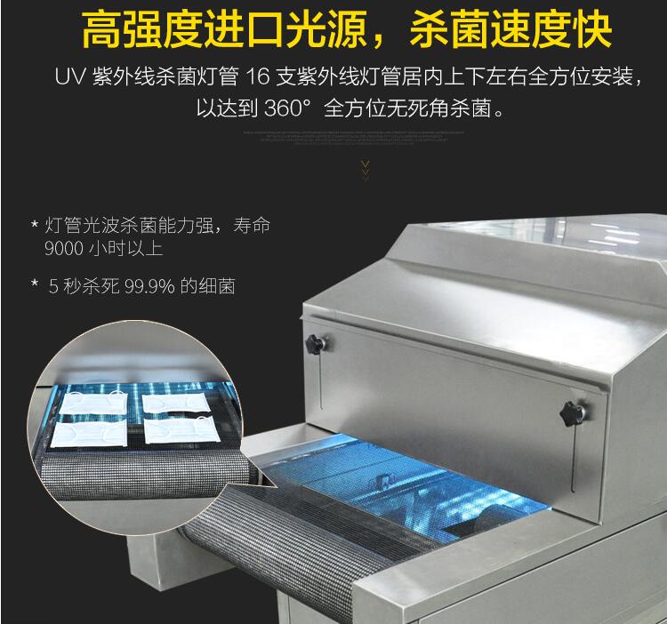 口罩紫外線消毒殺菌機 包裝食品滅菌(jun1)設(shè)備簡介: 設備的工作原理是:紫外線殺菌波段主要(yào)介於200~300nm之間,其中以253.7nm波長的殺菌能力強。當水或(huò)空氣中的各種(zhǒng)細菌病毒經(jīng)過紫外線(253.7nm波長)照射區域時,紫外線穿透微生物的細胞膜和(hé)細胞核(hé),破壞核酸(DNA或RNA)分子鍵,使其失去複製能力或失去活(huó)性而死亡,從而在不(bú)使用任何化(huà)學藥物的情況下殺滅所有的細菌病毒。殺菌燈不需要轉化為可見光,100-200nm的波長就能(néng)起到很好的殺菌作用,這是因為細胞對光(guāng)波的吸收譜線有一個規律,在100-200nm的紫外線有大的吸收,被(bèi)吸收的(de)紫外線實際上作(zuò)用於細胞遺傳物質即DNA,它起到一種光化作用,紫外光子的能量被DNA中的堿基對吸收,引起遺傳物質發生變異,使細菌當即死(sǐ)亡或(huò)不能繁殖後代,達到殺菌的目的。 滿足標準
