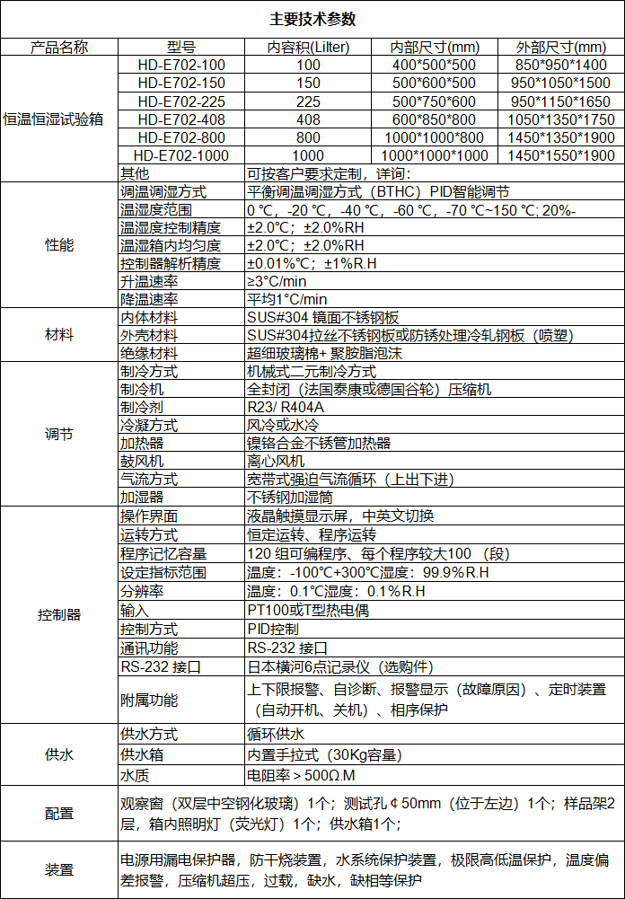高低溫濕熱交變試驗箱(xiāng)HD-E702也稱恒溫(wēn)恒濕試驗箱可模(mó)擬高溫高濕/高溫低濕/低溫高濕/高(gāo)溫/低溫(wēn)等不同環境條件下(xià)產品的適應能力。廣泛應用於電子、電(diàn)器、食品、汽車、橡塑膠、金(jīn)屬、化(huà)學、建材等產(chǎn)品的檢測。 設計標準(zhǔn): 1、GB/11158-2008《高溫試驗箱技術條(tiáo)件》; 2、GB/T10589-2008《低溫試驗箱技術條件(jiàn)》; 3、GB/T5170.2-2008《溫度試驗設備》; 4、GB/T5170.5-2008《溫熱試驗設備》; 5、GB/T2423.1-2008(IEC60068-2-1:2007)《試驗Ab:低溫試驗方法》; 6、GB/T2423.2-2008(IEC60068-2-2:2007)《試(shì)驗Bb:高溫(wēn)試驗方法》; 7、GB/T2423.3-2008(IEC60068-2-2:2007)《試驗Ca:恒定(dìng)濕熱試驗》; 8、GB/T2423.4-2008(IEC60068-2-2:2007)《試驗Bb:交(jiāo)變濕熱試驗》; 9、GJB150.3A-2009(MIL-STD-810F-2000)《高(gāo)溫試驗》; 10、GJB150.4A-2009(MIL-STD-810F-2000)《低溫試驗》; 11、GJB150.9A-2009(MIL-STD-810F-2000)《濕熱(rè)試(shì)驗》。 | ||