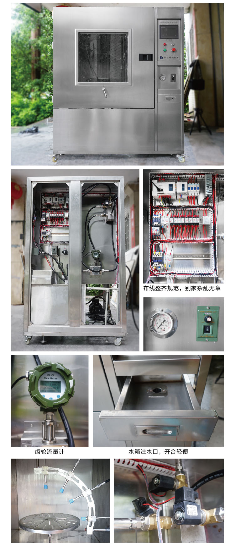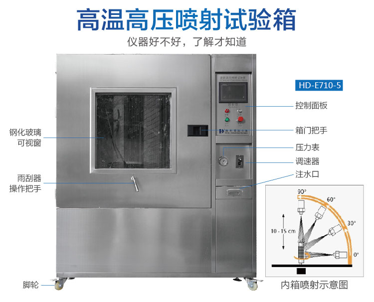 Model 型號HD-E710-5內箱尺寸(W*D*H)800*800*800mm1000*1000*1000mm外箱尺寸(W*D*H)1300*1000*1700mm1500*1200*1900mm內箱材質304不鏽鋼外(wài)箱材質不鏽鋼水溫80±5℃水壓(yā)80~100bar (8000~10000Kpa)100公斤水流量14~16L/min噴水距離10~15cm噴水角度和時間0°, 30°, 60°, 90°, 每個角度噴水30秒轉盤速度(dù)5RPM管徑25mm控製器PLC觸摸屏控製器水泵意大利進(jìn)口高溫高壓柱塞泵電源(yuán)三相,AC380V, 50/60HZ