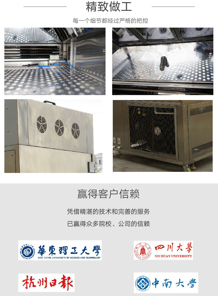 氙燈耐候試驗箱采(cǎi)用氙弧(hú)燈(dēng),可模擬全太陽光譜且存在(zài)於不同環境下的破(pò)壞性光波。此(cǐ)設備能提供相(xiàng)應的環境模擬和加速試驗,專門用於科研,產品開發和產品質量管控等等。是(shì)通過材料試樣暴露在氙弧(hú)燈的光照及熱輻射下進行老化試驗.來評(píng)價在高溫光源作用下某些材料的耐光、耐候性能.主要用於汽車、塗料、橡膠、塑料、顏料、粘合劑、織物等。