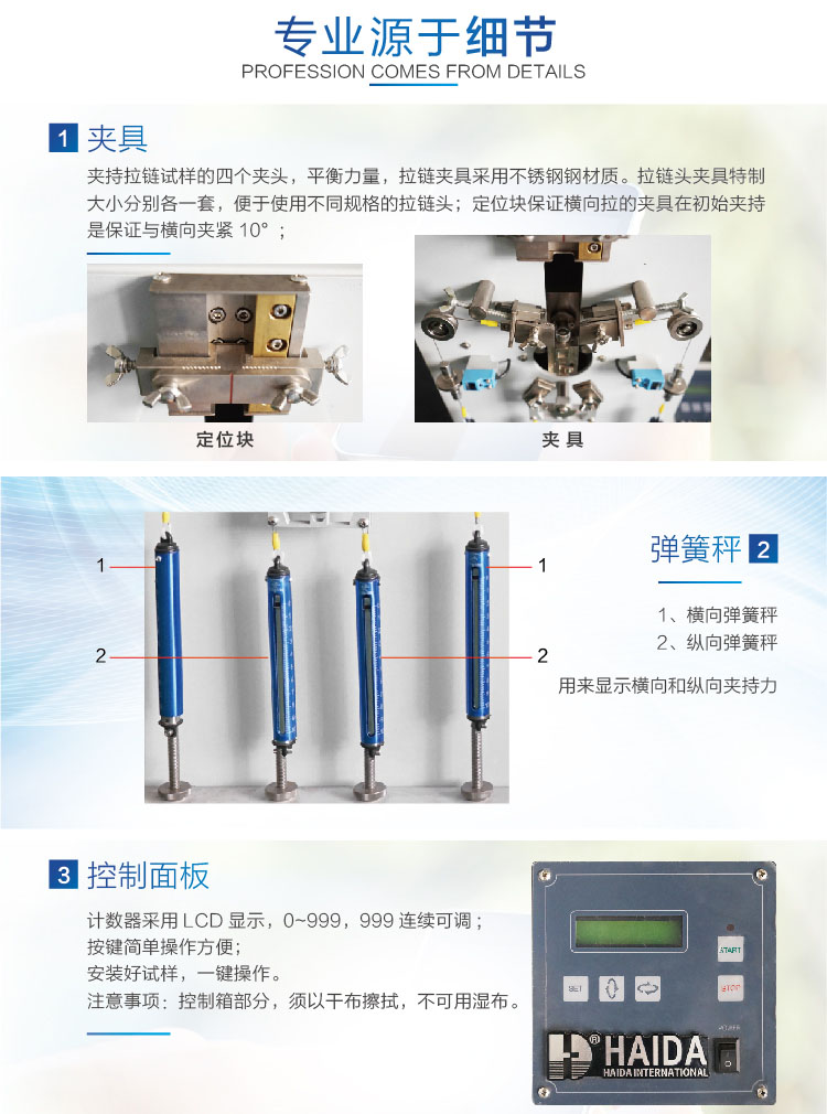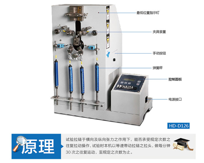 試驗拉鏈於橫向及縱向張力之作用下,能否承受規定次數之往複拉動操作,試驗時本機以等速帶動拉鏈之拉(lā)頭, 做每分鍾30次之往複運動,至規定之(zhī)次數為止 設計標準:CNS-1083 |
