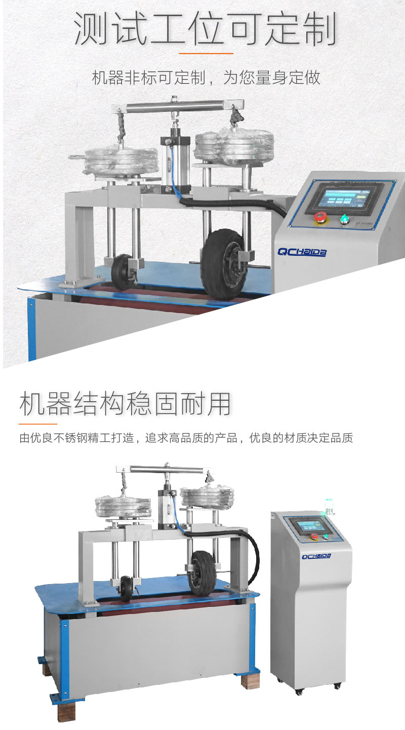 滑(huá)板車輪子耐磨測試機適用於小型(xíng)輪子的耐磨試(shì)驗,如旅行(háng)箱、滑(huá)冰鞋(xié)、童車、手推車的輪子。可測得輪子材料的耐磨性(xìng)及整體結(jié)構有無磨損及變形,試驗的結果可供作(zuò)改進的參考。 測試方法:置模型嬰兒於車台中,將車台(tái)固(gù)定於測(cè)試台上,調整輸送帶速(sù)度1.4±0.1m/sec(5kw/h±3.6 kw/h)。持(chí)續測試64小時後,目視車台有(yǒu)無損(sǔn)壞(huài)。達設定次數能自動停止操作。試驗速度:可調LED顯示 時間設定:9999 分鍾負荷:重量(約):約95kg 設計標準(zhǔn):滿足(zú)QB/T 2917-2007 |