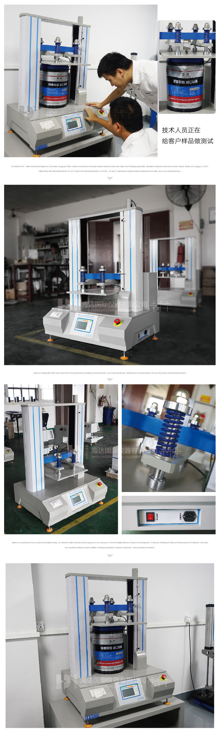 小型觸摸屏式紙箱抗壓試驗機HD-A501-500是(shì)檢驗紙箱或其它包裝容器耐壓強度(dù)最直接的測試儀器,用於判定紙(zhǐ)箱的抗壓能(néng)力,並(bìng)可做持壓堆(duī)碼的測試,試驗的(de)結果可作為工廠堆放成品包裝箱高(gāo)度的重要參考或是設計包裝箱的重要依據。適用於瓦楞紙箱、蜂窩板(bǎn)箱等包裝件的耐(nài)壓、形變、堆碼試驗。並兼顧塑料桶(食用油(yóu)、礦泉水)、紙桶、紙(zhǐ)盒、紙罐、集裝容器桶(IBC桶)等容器(qì)的抗壓試驗。 設計標準:TAPPI-T804,JIS-20212,GB4857.3.4, ASTM-D642, QB/T1048, BS EN ISO 12048, GB/T4857.16, GB/T8167, GB/T8168, GB/T4857.3,GB/T4857.4 | ||